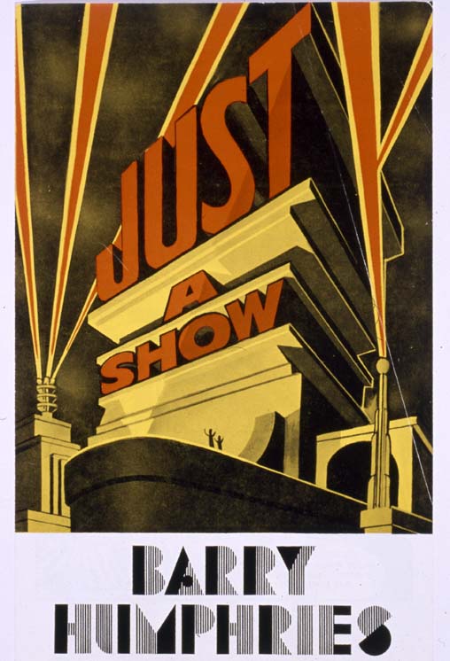 Handbill for Barry Humphries' one-man show "Just A Show". Single page, folded. Printed on the cover in orange, yellow and black on a white background, with the title mimicking 20th Century Fox graphics. The inside features a full-page cartoon, drawn by Barry Humphries on the left, and production details including theatre, dates, and ticket prices. The back cover features a black and white photograph of Barry Humphries with his back to the camera, on an orange background. This handbill advertised a season of "Just A Show" at the Tivoli Theatre, Sydney, August 19 - September 21, 1968. The production was presented by Clifford Hocking in arrangement with J.C. Williamson Theatres Ltd. |