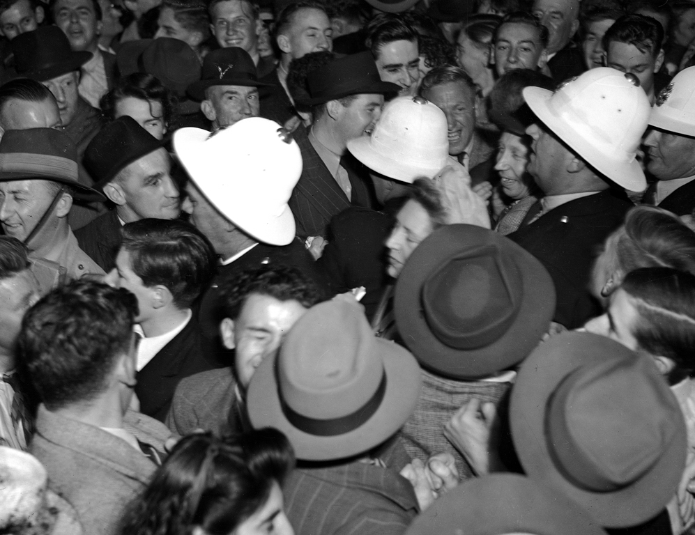 Negative, black and white. George Formby standing among crowd of people. Image shows heads of people and hats worn by males, particularly in foreground. George Formby was a UK Comedian. Venue is the Tivoli Theatre, Melbourne, 1947. |