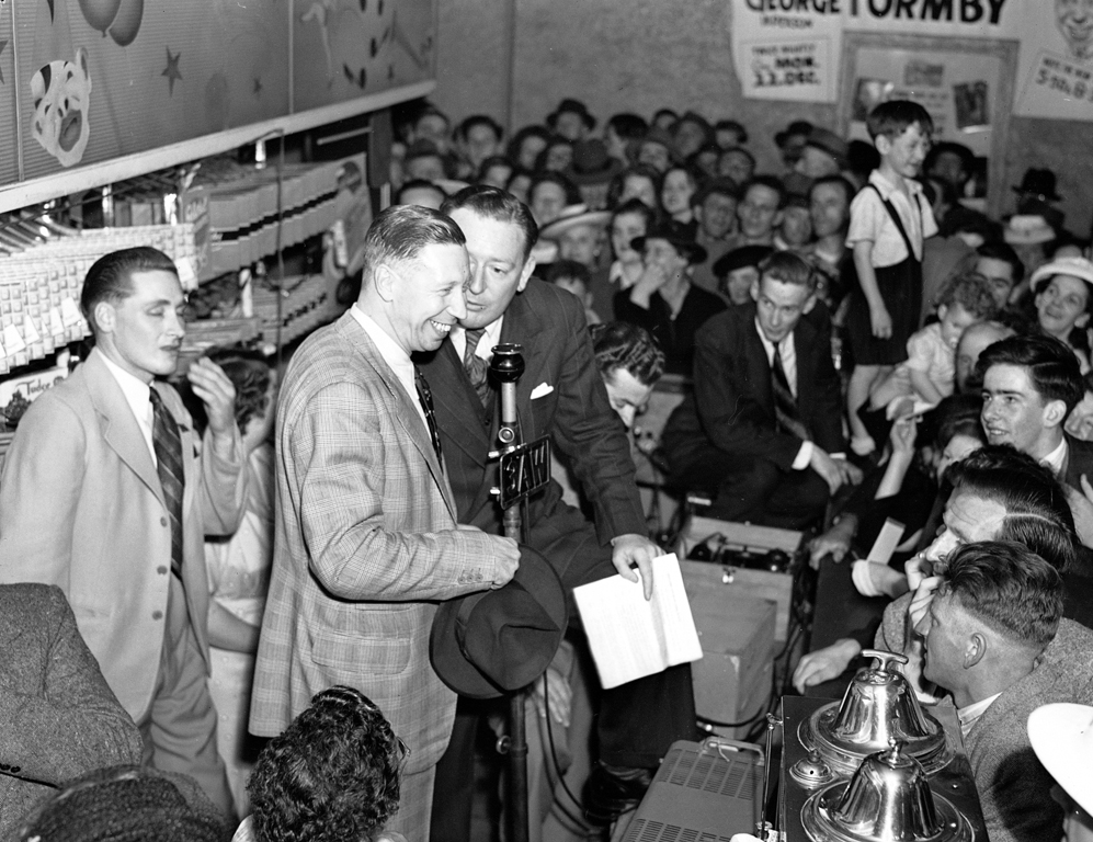 Negative, black and white. George Formby standing in front of a crowd of people. He is standing at a microphone and is holding his hat in his hand. Sign in background advertising his show. Tivoli Theatre foyer, Melbourne. 1947. George Formby was a UK comedian. Venue is the Tivoli Theatre, Melbourne, 1947. |