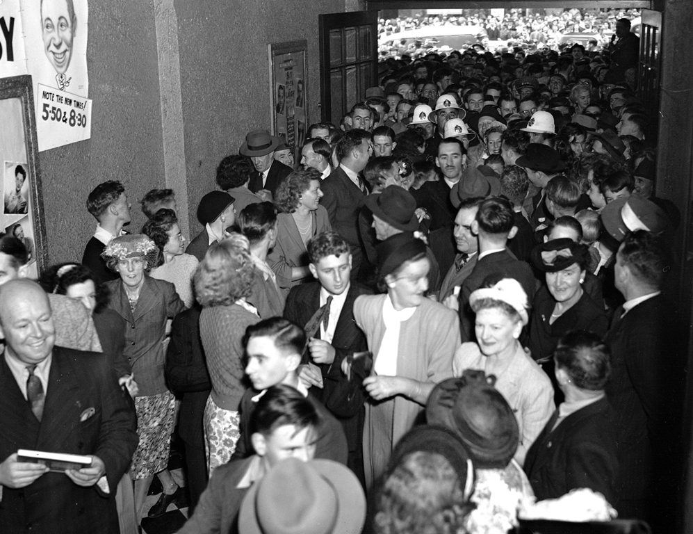 Negative, black and white. Crowd of people in the foyer of Tivoli Theatre, Melbourne, gathered to see George Formby. He appears to be in the middle of the crowd near the doorway. Signs on wall advertising his show.. George Formby was a UK comedian. Venue is the Tivoli Theatre, Melbourne, 1947. |