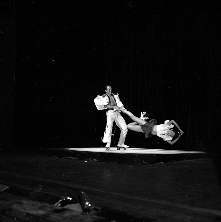 Negative, black and white. Roller skating couple, Duo Merenos, performing on a raised platform which is on a stage. Male is holding female by one ankle and spinning her around. She has hands together above her head with elbows bent and one leg bent. Written in black ink, upper right: "FT10". Probably at Tivoli Theatre. c. 1950. |