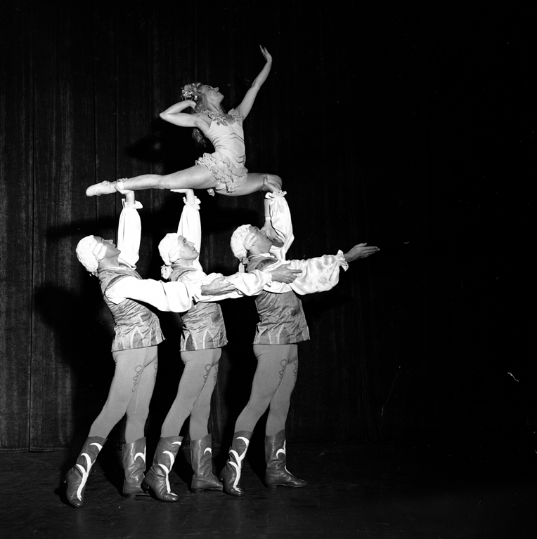 Negative, black and white. Acrobatic (Equilibrist) act "Ganjou Brothers and Juanita". Three males and one female on stage. Males standing in line balancing female above their heads with left arms. She is doing the splits with front knee bent All in costume, males wearing wigs, boots and patterned tunics. Written on upper edge in black ink: "GANJOU BROTH. + JUANITA 6". Tivoli Theatre, c. 1949. Ganjou Brothers were: George, Eob and Serge, with Jaunita. Appeared in "Grandfather's Follies" at Tivoli Theatre, 1949. |