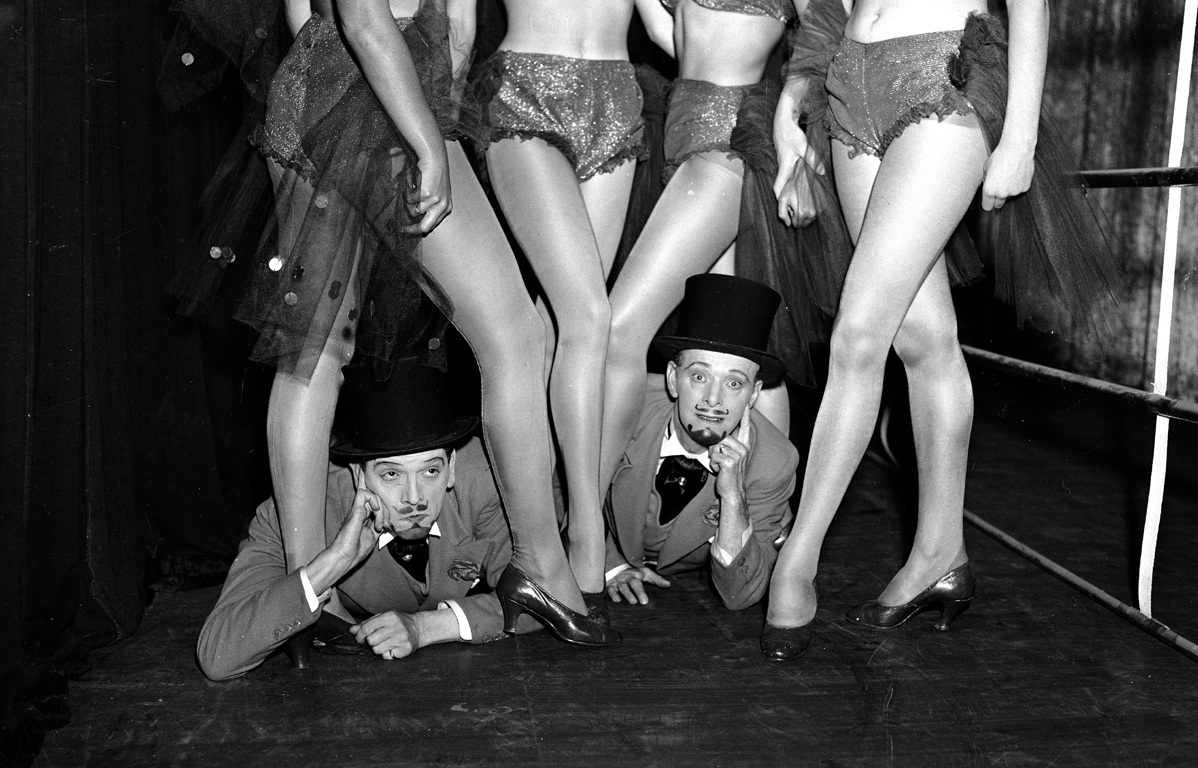Negative, black and white. Comedy/dance performers Dumarte and Denzer lying on floor with head and shoulders between the legs of 4 females. Dumarte and Denzer are each wearing top hat, jacket, shirt and cravat. Image cropped so only lower half of females visible. They are wearing bikini style costumes with tulle. "All The Best", Tivoli Theatre, c. 1948. |
