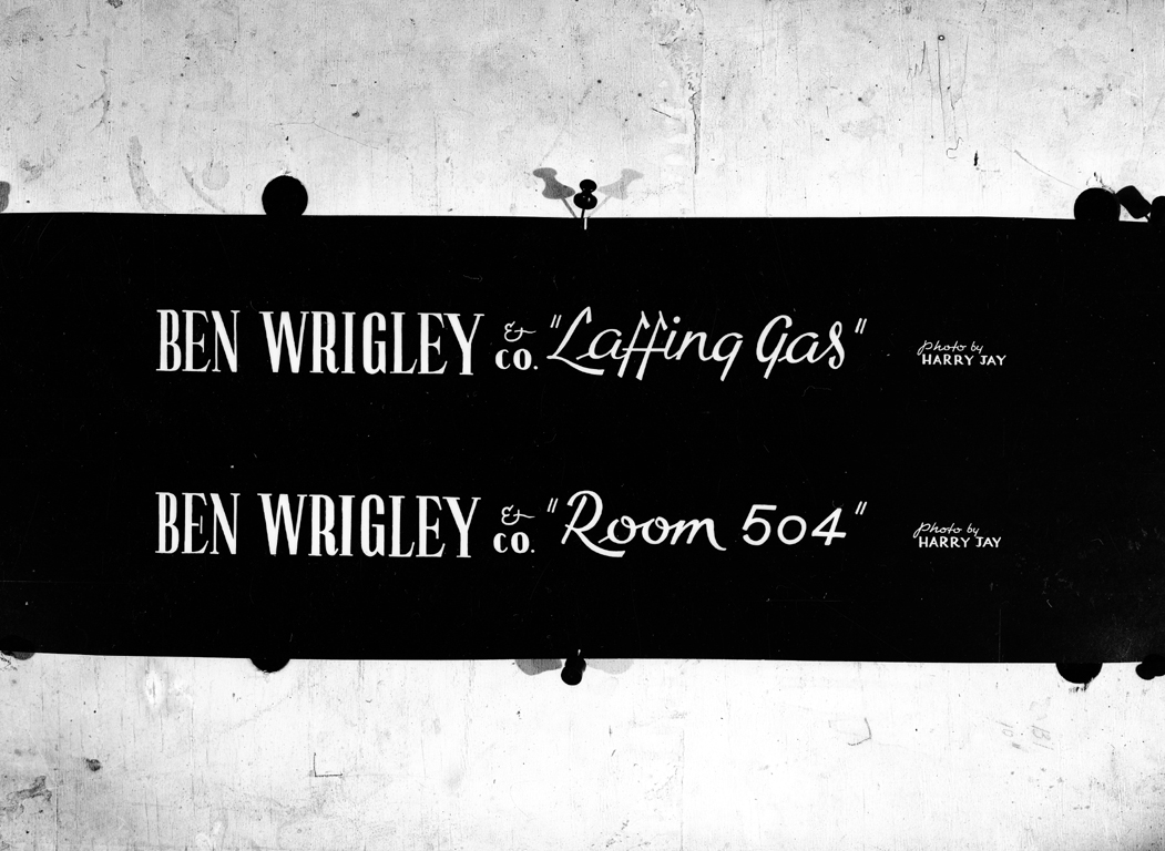 Negative, black and white. Sign or captions pinned to a board. Text: "BEN WRIGLEY and CO 'Laffing Gas' photo by HARRY JAY / BEN WRIGLEY and CO 'Room 504' photo by HARRY JAY" |