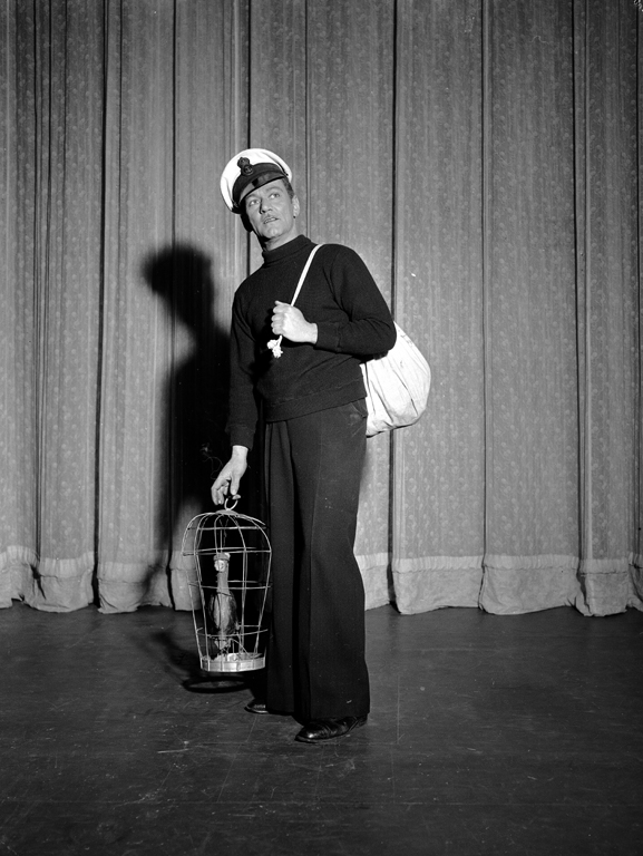 Negative, black and white. Full length shot of Victor Moore on stage with theatre curtain behind. He is wearing dark trousers and jumper, nautical style cap and is carrying draw string bag over right shoulder and bird cage with bird in left hand. Head tilted to left. Written in black ink, upper edge: "VICTOR MORE [sic] 1". Possibly at Tivoli Theatre. |