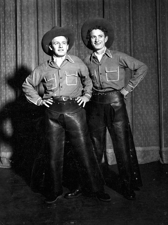Negative, black and white. Full length shot of Tex and Lucky on stage with theatre curtain behind. Both are wearing cowboy outfits, including leather chaps. Both standing with feet apart and hands on hips. Written in black ink, upper edge: "TAX [sic] + LUCKY 3". Possibly at Tivoli Theatre. c. 1940s. |