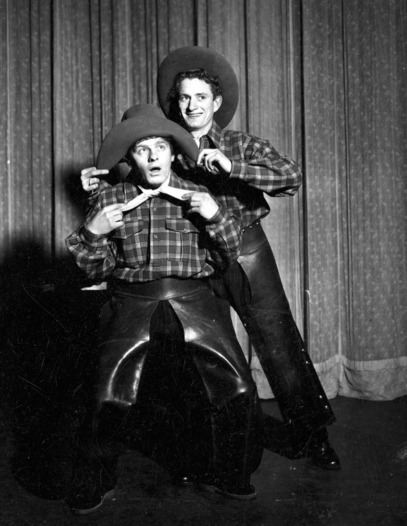 Negative, black and white. Full length shot of Tex and Lucky on stage with theatre curtain behind. Both are wearing cowboy outfits, with checked shirts and leather chaps. Front figure with bent knees and holding ends of neck scarf, with brim of hat being held down by partner. Written in black on upper edge: "TAX [sic] and LUCKY 1". Possibly at Tivoli Theatre. c. 1940s. |