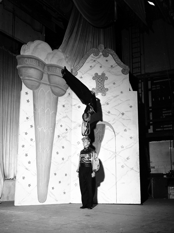 Negative, black and white. Full length shot of acrobatic/balancing duo The Ashworths (two males) on stage near wings with backstage area partly visible. One man standing with other balancing in one handed handstand position on his head Set depicting large ice cream in cone behind them. Written in black ink, upper edge: "THE ASHWORTH 3". Probably at Tivoli Theatre, c. 1940s. |