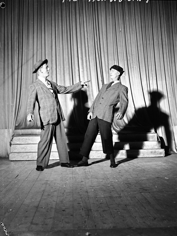 Negative, black and white. Full length shot of acrobatic/balancing duo The Ashworths (two males) on stage with curtain and platform of steps behind. Both wearing suits and hats, standing with feet apart. Man on left pointing at man on right who is leaning back. Written in black, upper edge: "THE ASHWORTH 7". Possibly at Tivoli Theatre, c. 1940s. |