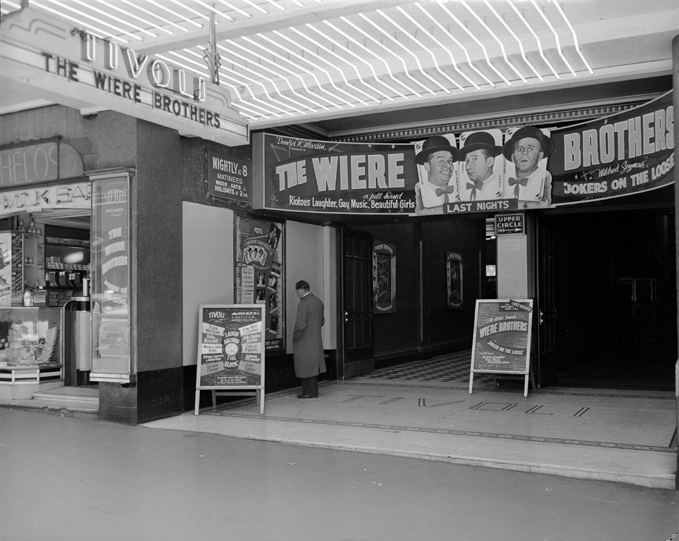 Negative, black and white. Front of house area (exterior) of the Tivoli Theatre, Melbourne, containing signage advertising The Wiere Brothers in "Jokers On The Loose", 1955. |