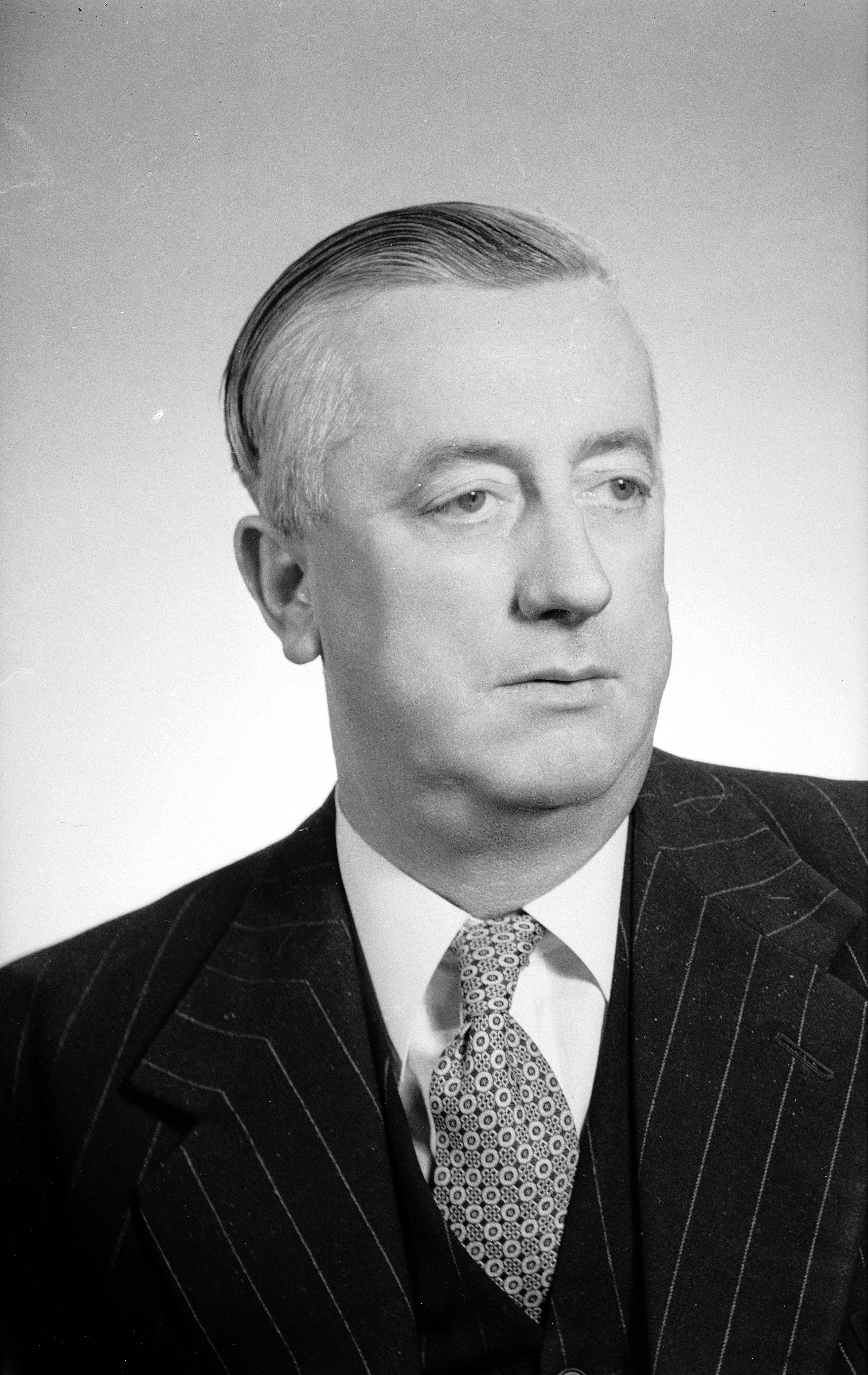 Negative, black and white. Head and shoulders portrait shot of Bill McKechnie. He is wearing a pin-striped suit, waistcoat and patterned tie. Head turned slightly and not looking directly at camera. Written in black ink, upper edge: "B. McKECHNY 1"[sic]. Silver markings on face (emulsion side) from retouching image. c. 1950s. |