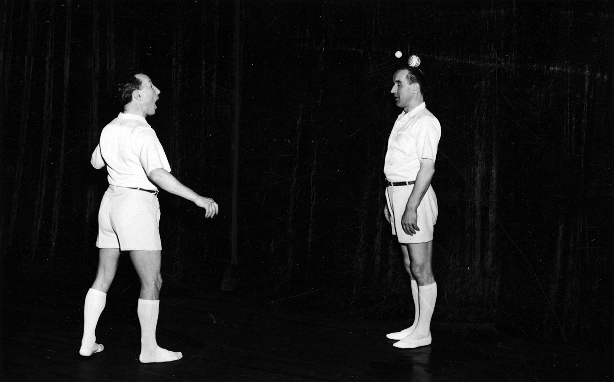 Negative, black and white. Full length image of juggling act Balladinis perform- ing on stage. Two men wearing shirts, shorts, long socks and shoes. Man on left standing having blown ping-pong ball from mouth towards larger ball balanced on partner's head. Stage curtain in background. In black ink, upper edge: "2566-18". Probably taken for Tivoli show "Say It With Stars", 1958. |