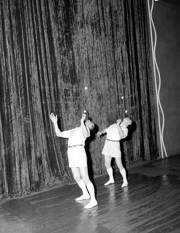 Negative, black and white. Full length image of juggling act Balladinis perform- ing on stage. Two men wearing shirts, shorts, long socks and shoes. Both standing and leaning back while juggling ping-pong balls blown from the mouth. Stage curtain in background. In black ink, upper edge: "2566-3". Probably taken for Tivoli production "Say It With Stars", 1958. |