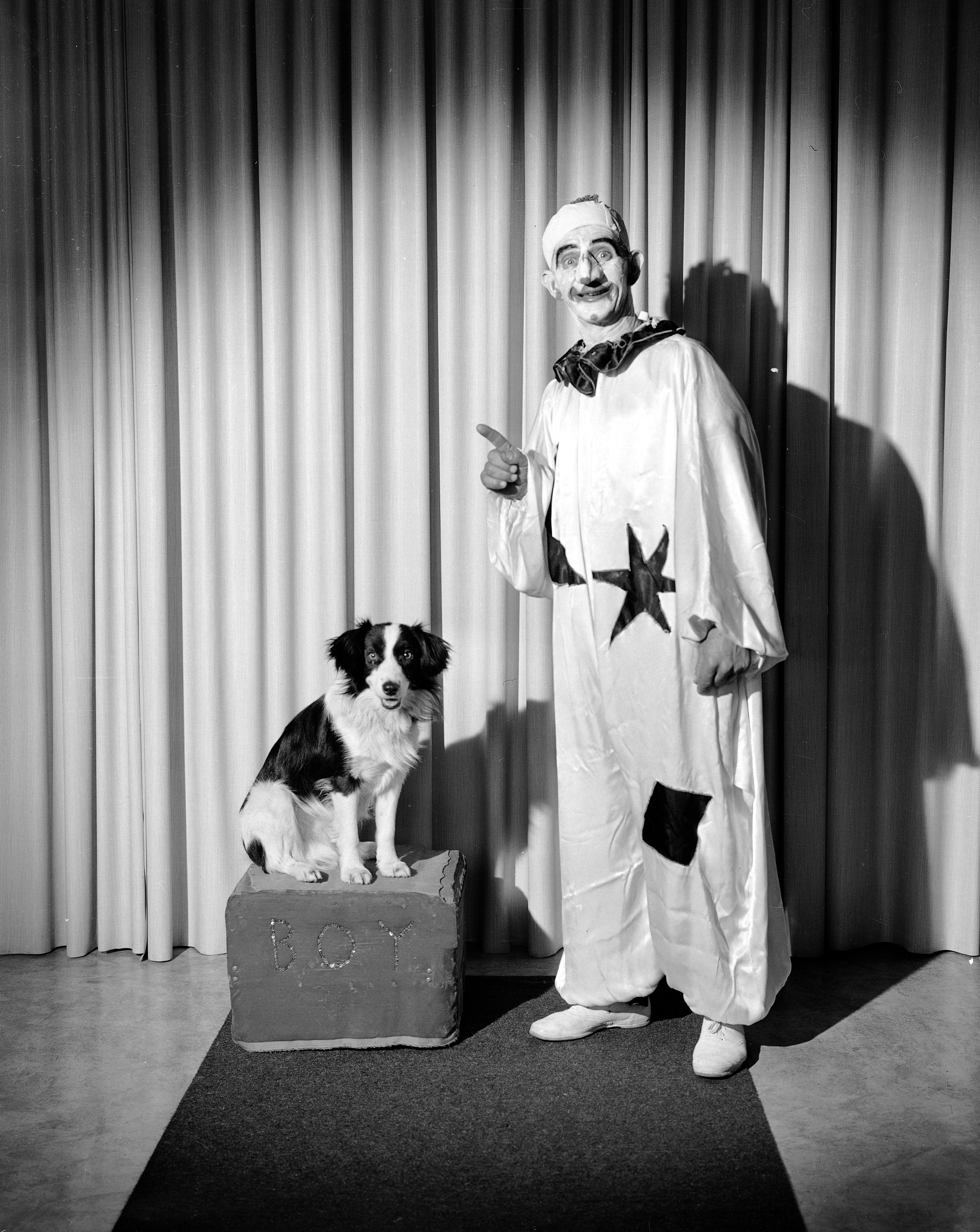 | Abstract/Description | Negative, black and white. Full length image of clown, Terry Carr, on stage with his dog. Carr is wearing clown costume and make-up, standing beside dog who is sitting on box with lettering "BOY". Stage curtain behind. In black ink, upper edge: "CARR 2690-1". c. 1958. Terry Carr and his flying dog "Boy" performed as a specialty act with "Puss In Boots", Tivoli, 1958. | |