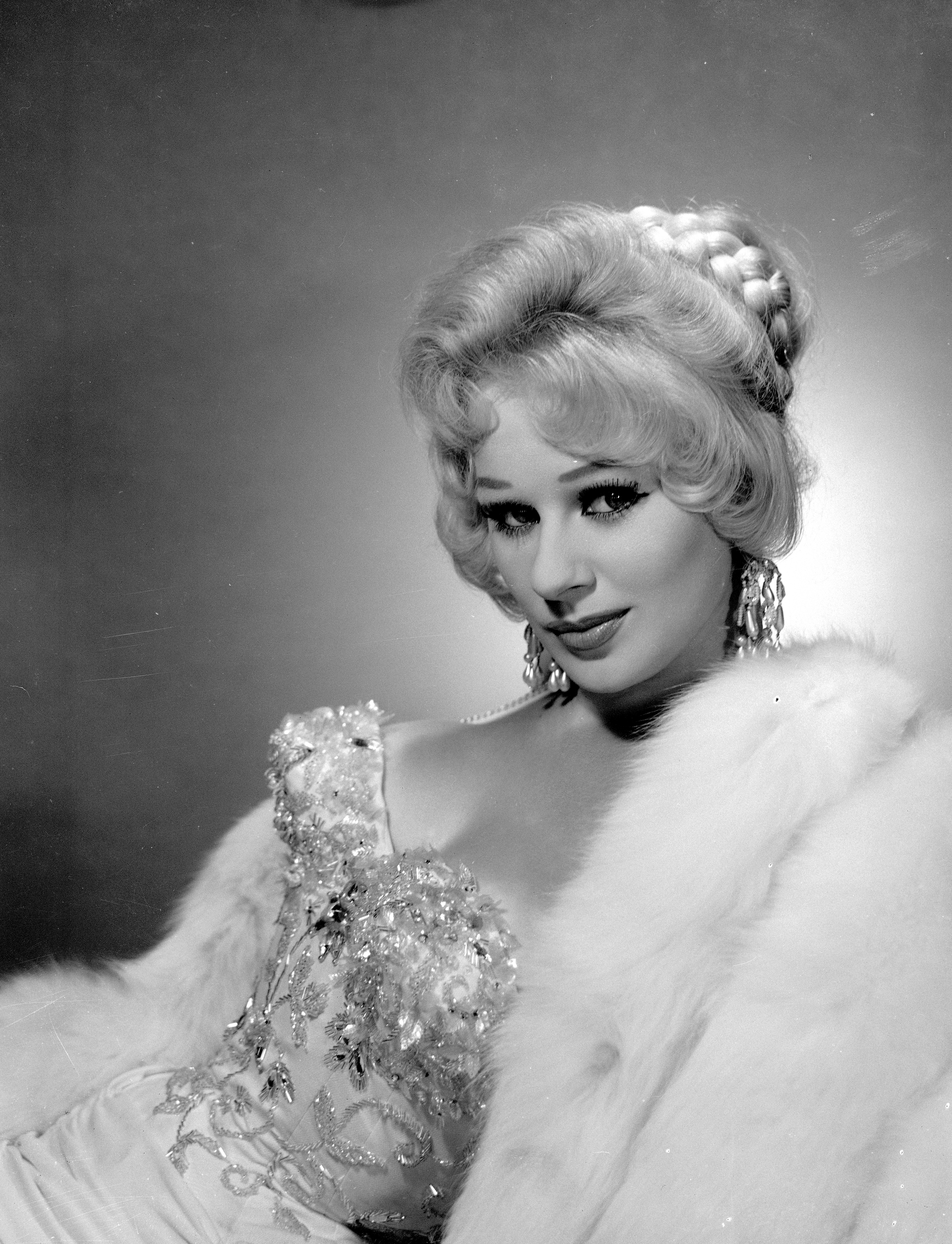 Negative, black and white. 1/2 length image of Sabrina, reclining. Wearing beaded evening dress, long earrings, white fur around shoulders. Hair is up with plait around bun. In black ink, upper edge: "SABRINA 2958-2". Markings on skin areas (emulsion side) from retouching image. c. 1959. Sabrina was the stage name of Norma Sykes. Her claim to fame was the size of her bust. She appeared in "Pleasures of Paris", Tivoli Circuit, 1959. |