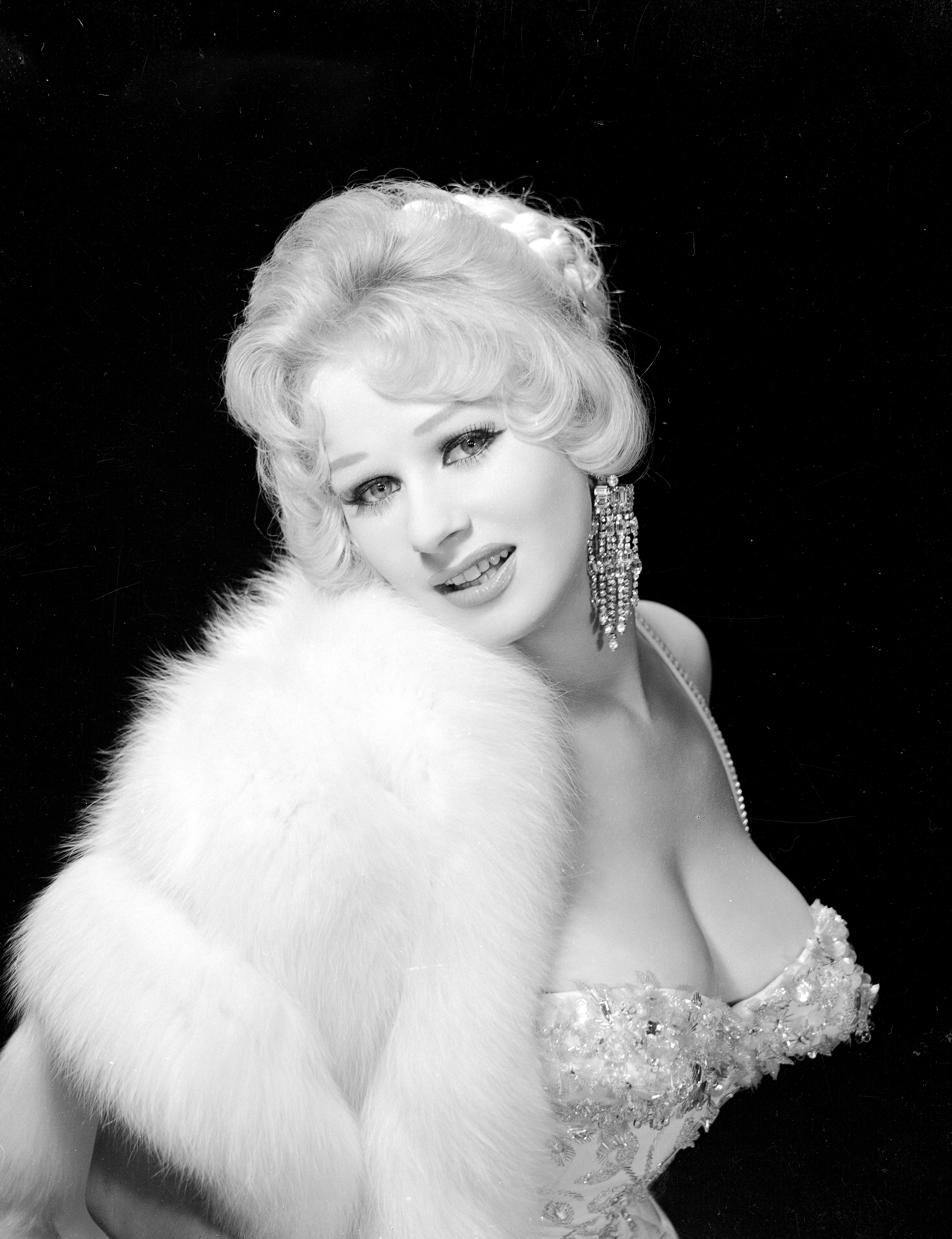 Negative, black and white. Full length image of Sabrina standing with hands on hips, facing camera. She is wearing tight fitting evening dress with decorated bodice, long earrings, high-heeled sandals and stole draped across front of neck and falling behind back. In black ink, upper edge: "SABRINA 2859-10". Markings on skin areas (emulsion side) from retouching image. c. 1959. |
