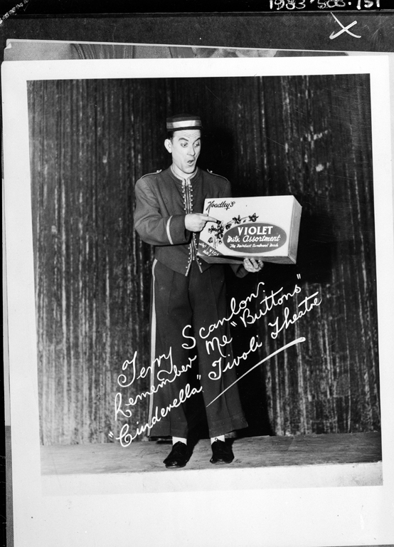 Negative, black and white. Full length shot of Terry Scanlon wearing bell boy costume for role of Buttons in "Cinderella" pantomime. He is standing in front of a theatre curtain and holding a large box of Hoadley's Violet Milk Assorted chocolates. Lettering: "Terry Scanlon Remember Me "Buttons" "Cinderella" Tivoli Theatre". Black ink cross upper right corner. No date. |