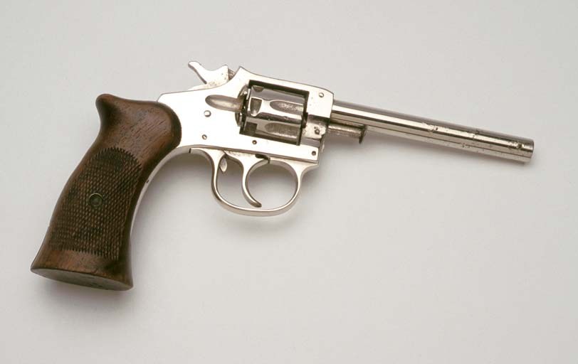 Pistol, chrome-plated Hunter model. Used at the London Palladium and throughout Australia on the Tivoli Circuit. c.1934. Prop used by Will Mahoney as 'Wild Bill Hiccup' in the review "Ride 'Em Cowboy" (1934 - 1945). |