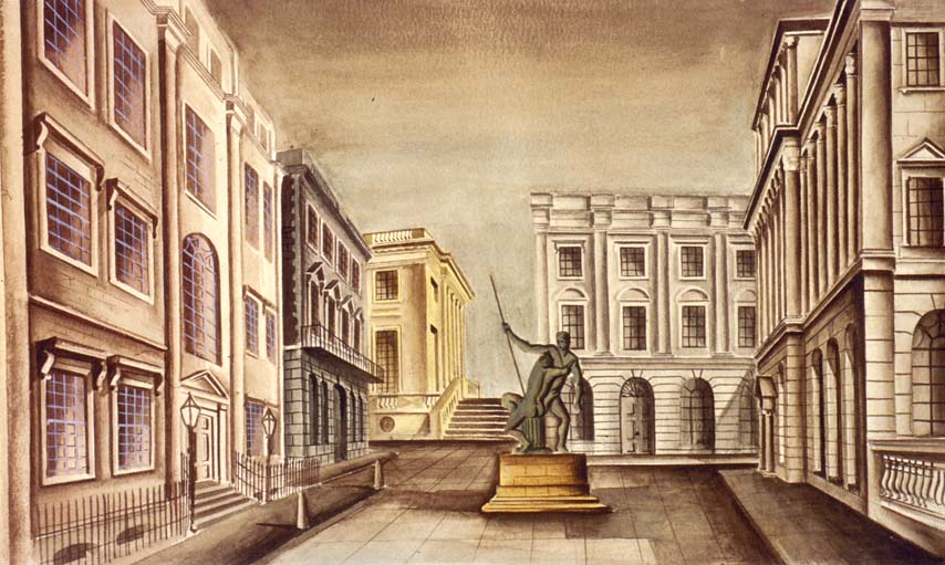Set design by Anne Fraser. Street scene of square with a statue in the centre and three story buildings around square. Statue (green tone) of two male figures on a plinth. Beige, grey, green and brown tones.